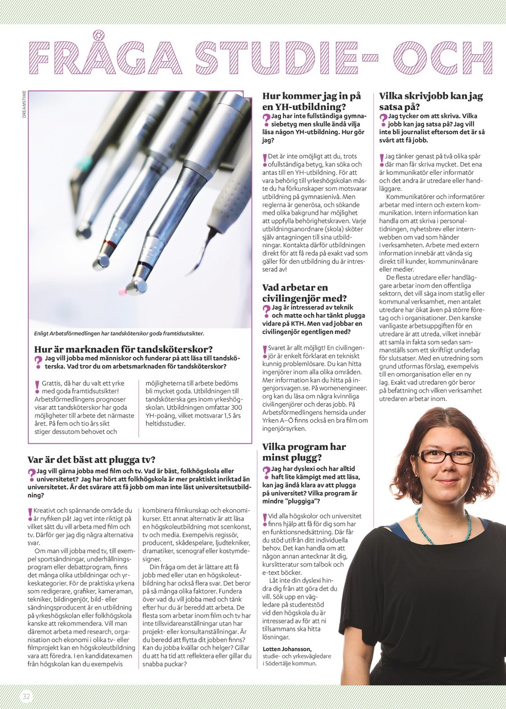 Där jag jobbar nu jobbar vi mycket i team där arbetsterapeuter ingår. Vad tycker du om utbildningen ? Vi är den första kursen i det nya programmet, så det har varit en del förändringar. Du är en kreativ person som alltid använder din fantasi, även om du bara ska borsta tänderna. För att du ska trivas på jobbet är det oerhört viktigt att du får jobba efter dina premisser. Du skulle aldrig trivas på ett jobb med rutiner.
